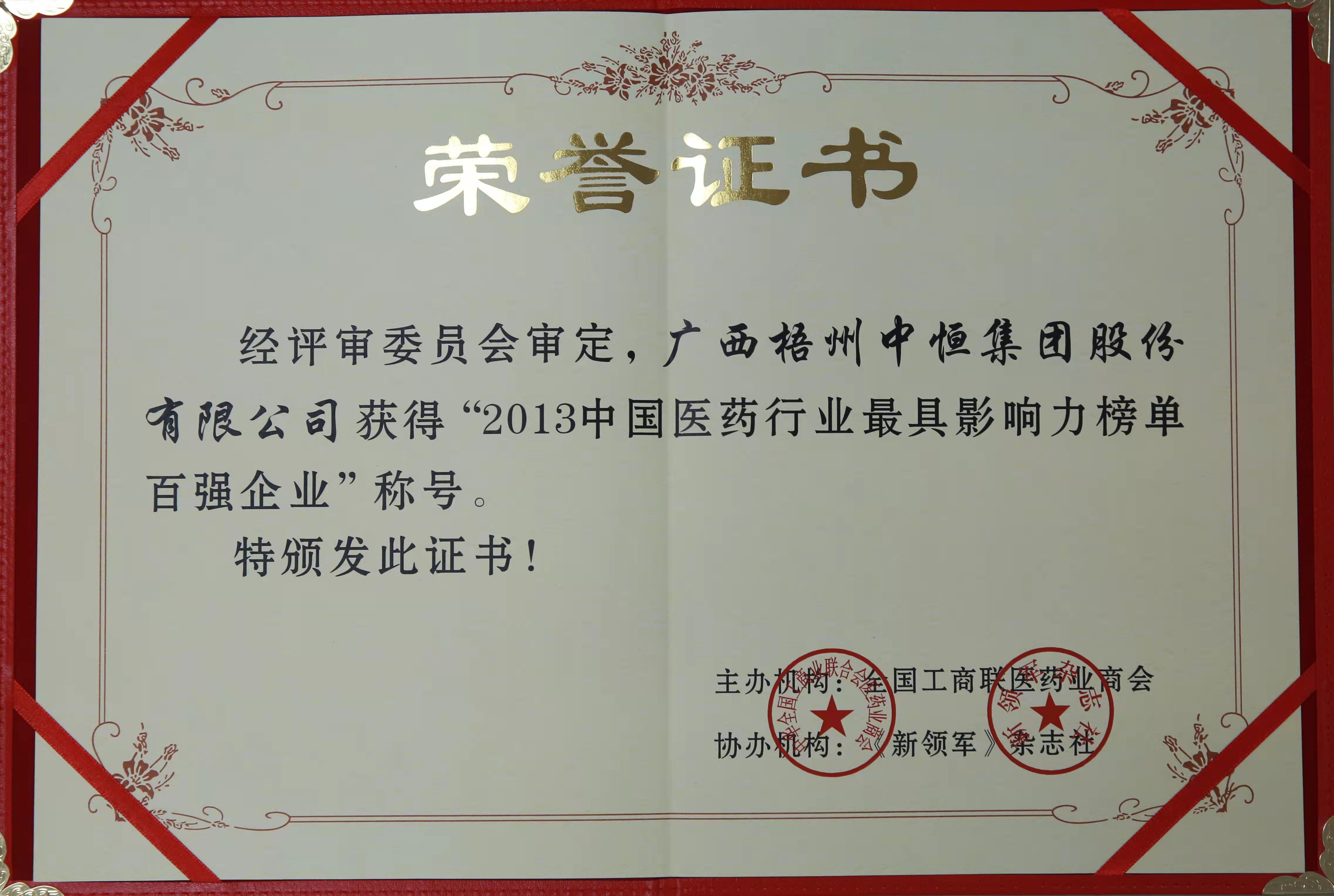 榮獲“2013年中國(guó)醫(yī)藥行業(yè)最具影響力百?gòu)?qiáng)企業(yè)”稱號(hào)
