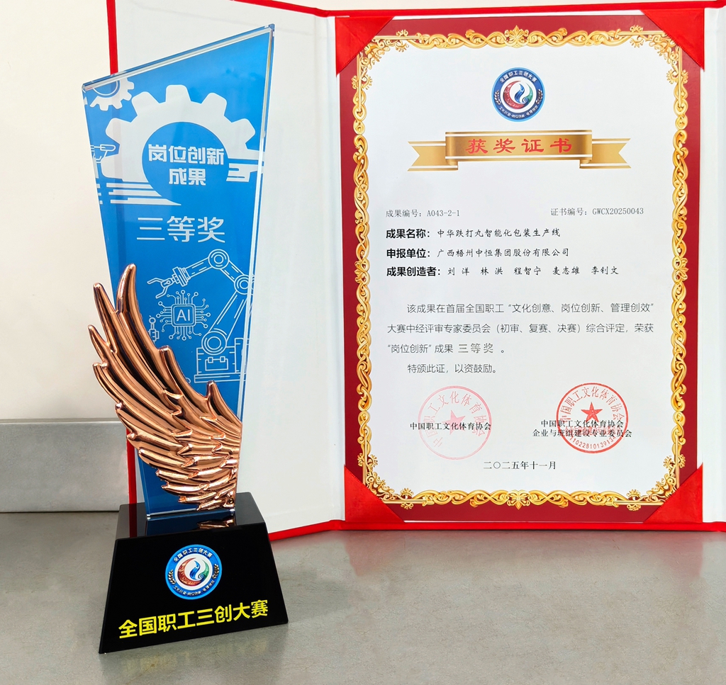 廣西梧州制藥(集團(tuán))股份有限公司中華跌打丸智能化包裝生產(chǎn)線(xiàn)榮獲“崗位創(chuàng)新“成果 三等獎(jiǎng)
